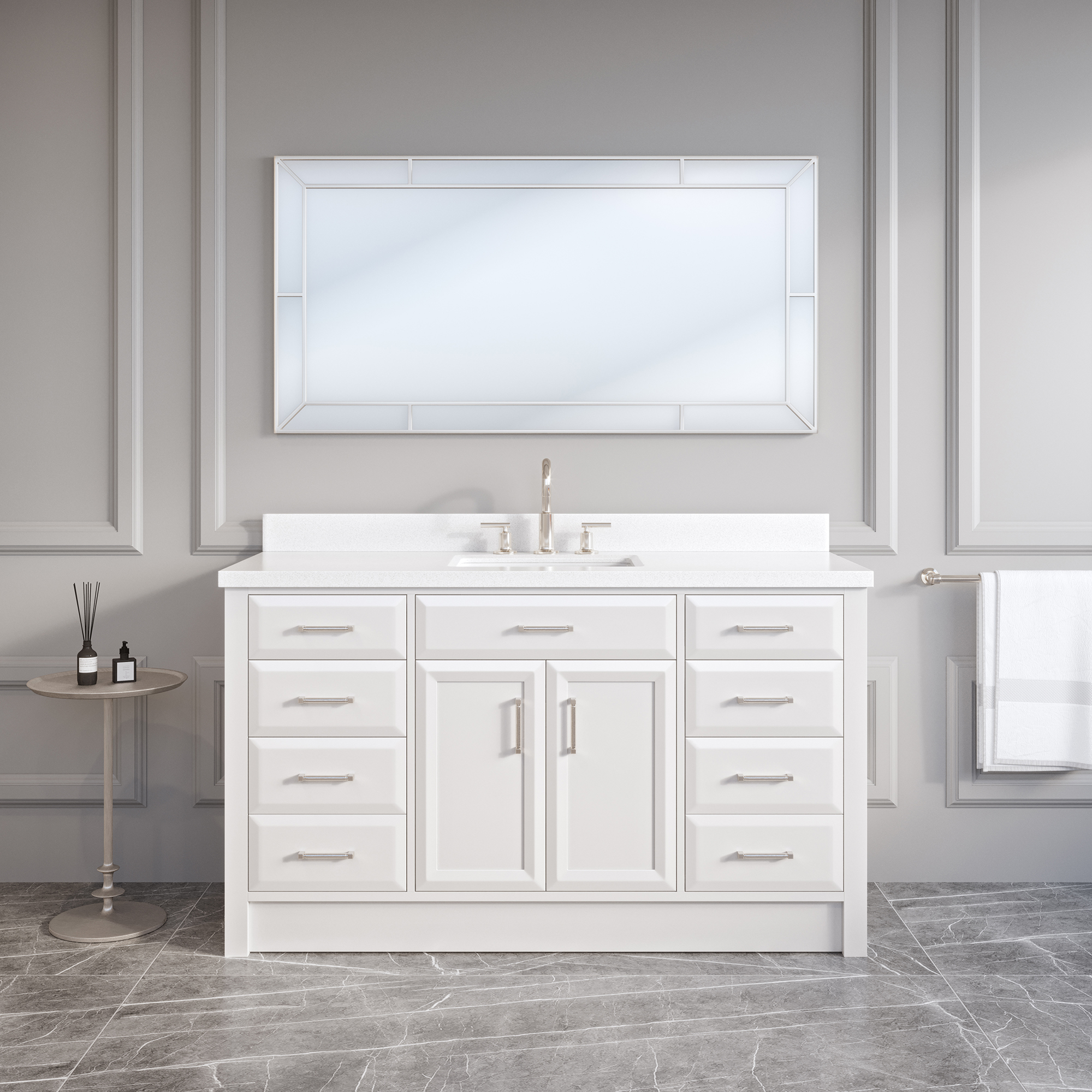 Transformez votre salle de bain en un véritable sanctuaire avec notre luxueuse vanité. Comptoir élégant en quartz diamant qui reflète la lumière du matin, barre d’alimentation intégrée pour garder vos appareils chargés et un tiroir parfaitement organisé grâce à l’organisateur inclus. De plus, des kickplates élégantes ajoutent une touche d’élégance moderne tout en simplifiant votre routine de nettoyage. Cette vanité a tout pour plaire.